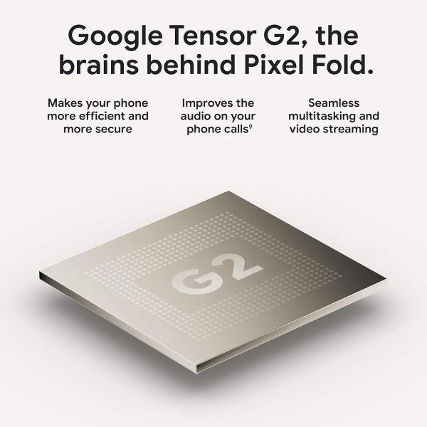 Meet Pixel Fold, the first foldable phone engineered by Google. All the power of the Google Tensor G2 chip – in a thin, pocket-size design. It’s a Pixel phone on the outside. And a big, immersive display on the inside for entertainment and multitasking. So you can do even more, in so many ways. LEGAL [1]Requires compatible apps. [2]Works with all major carriers. 5G service is carrier dependent. Requires a 5G data plan (sold separately). 5G service not available on all carrier networks or in all areas. Contact carrier for details. 5G service, speed, and performance depend on many factors, including carrier network capabilities and signal strength. Actual results may vary. Some features not available in all areas. Data rates may apply. See g.co/pixel/networkinfo for info. [3]Common Criteria certification for hardware and cryptographic library. See g.co/pixel/certifications for details. [4]Restrictions apply. Some data is not transmitted through VPN. Not available in all countries. All other Google One membership benefits sold separately. This VPN offer does not impact price or benefits of Google One subscription plan. Use of VPN may increase data costs depending on your plan. See g.co/pixel/vpn for details. [5]Face Unlock available on outer display only. [6]Designed to comply with water protection rating IPX8 under IEC standard 60529 when each device leaves the factory but the device is not waterproof. The accessories are not water resistant. Water resistance is not a permanent condition and will diminish or be lost over time due to normal wear and tear device repair. disassembly or damage. Dropping your device may result in loss of water resistance. Liquid damage voids the warranty. See g.co/pixel/water for details. [7]Watch, tablet, and earbuds sold separately. [8]Based on third-party global research firm report. Evaluation considered features that may not be available in all countries. See goo.gle/mobilesecurity2022 for more information. [9]US only. English only. Call Screen may not detect all robocalls and spam calls. [10]Your Pixel will generally receive Feature Drops during the applicable Android update and support periods for the phone. See g.co/pixel/updates for details. Availability of some Feature Drops may vary. [11]For “all day”: Estimated battery life based on testing using a median Pixel user battery usage profile across a mix of talk, data, standby, and use of other features. For “up to 72 hours”: Estimated battery life based on testing using a median Pixel user battery usage profile across a mix of talk, data, standby, and use of other features. Battery testing conducted on a major carrier network. For both claims: Battery testing conducted in California in early 2023 on pre-production hardware and software using default settings. Battery life depends upon many factors and usage of certain features will decrease battery life. Actual battery life may be lower. [12]Not available for all camera apps or modes. [13]Maximum resolution and field of view not available for all camera apps or modes. [14]Pixel Stand sold separately.