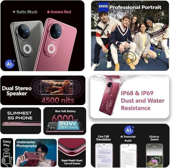 Vivo V50 5G – Ancora Red 12 + 256GB | 50MP ZEISS Camera | 3D curved 120Hz AMOLED Display | 6000mAh | IP69, 4Y Battery |18 Months Warranty – UAE Version